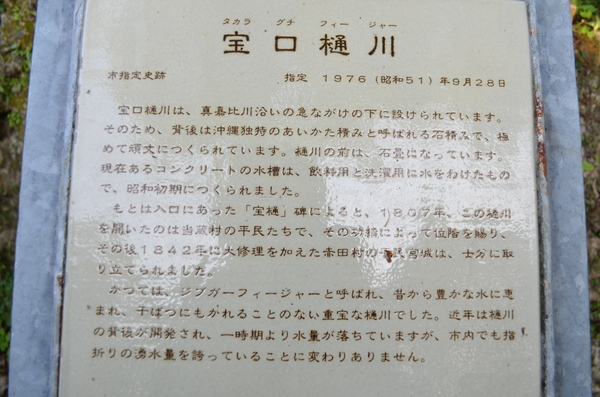 付近の地名、宝口にちなんで呼ばれるこの樋川(ヒージャー)は、大小の琉球石灰岩をあいかた積みにして背面の壁や石垣を築いている。前庭にも石を敷きつめているが、昭和初期にコンクリートを用いて飲料水と洗濯用水を分ける水槽が設けられた。付近の道路工事や宅地造成のため、うしろの山が開かれ樹木も伐採された。1986(昭和61)年1月の1日の湧水量は112.5リットルあったが、今ではほとんど失われている。また水質は生活排水が混ざるなどして、飲めなくなってしまった。入口には「宝樋(たからひ)」と題する碑文があったが、戦後すぐのころに破壊され、台座が残されるのみとなった。ところが1986(昭和61)年、樋川の前を流れる真嘉比川の工事に伴い40年ぶりに川床から発見され、那覇市教育委員会に保管されている。この碑文は、1807(嘉慶12)年に赤田村の人々が大きな修理をした際に建てられたもので、その開設の由来・修理の経緯などが記されている。 - 情報引用元